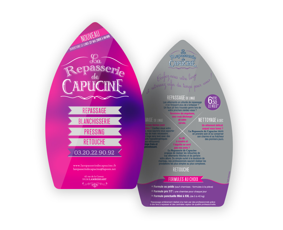Conception de l'identité visuelleDéclinaison graphique sur flyer (avec forme de découpe) et signalétique extérieure